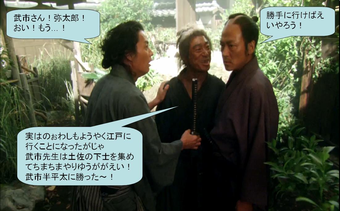 谷口の大好きなドラマは、2010年放送のNHK大河ドラマ『龍馬伝』。. そんな中で、武市半平太の正義が悪に変わってしまって、いい人だったのに.. 龍馬伝 13回 さらば土佐よ 弥太郎(香川照之)は、龍馬(福山雅治)の暗殺を命じられたが、実行できなかった。 龍馬は武市半平太(大森南朋)が吉田東洋(田中泯)を殺そうとしていると知り、東洋に会いに行く。